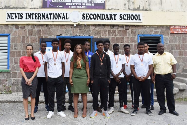 Presentations to hand over trophies and medals were held simultaneously on Wednesday May 29 at the winning school and at the third placed school. At the Nevis International Secondary School which had been sponsored by the Development Bank of St. Kitts and Nevis, Mr Raybo Smith represented the Department of Sports, while Ms Hyacinth Pemberton, Manager of the Nevis branch of the Development Bank, represented the sponsor.